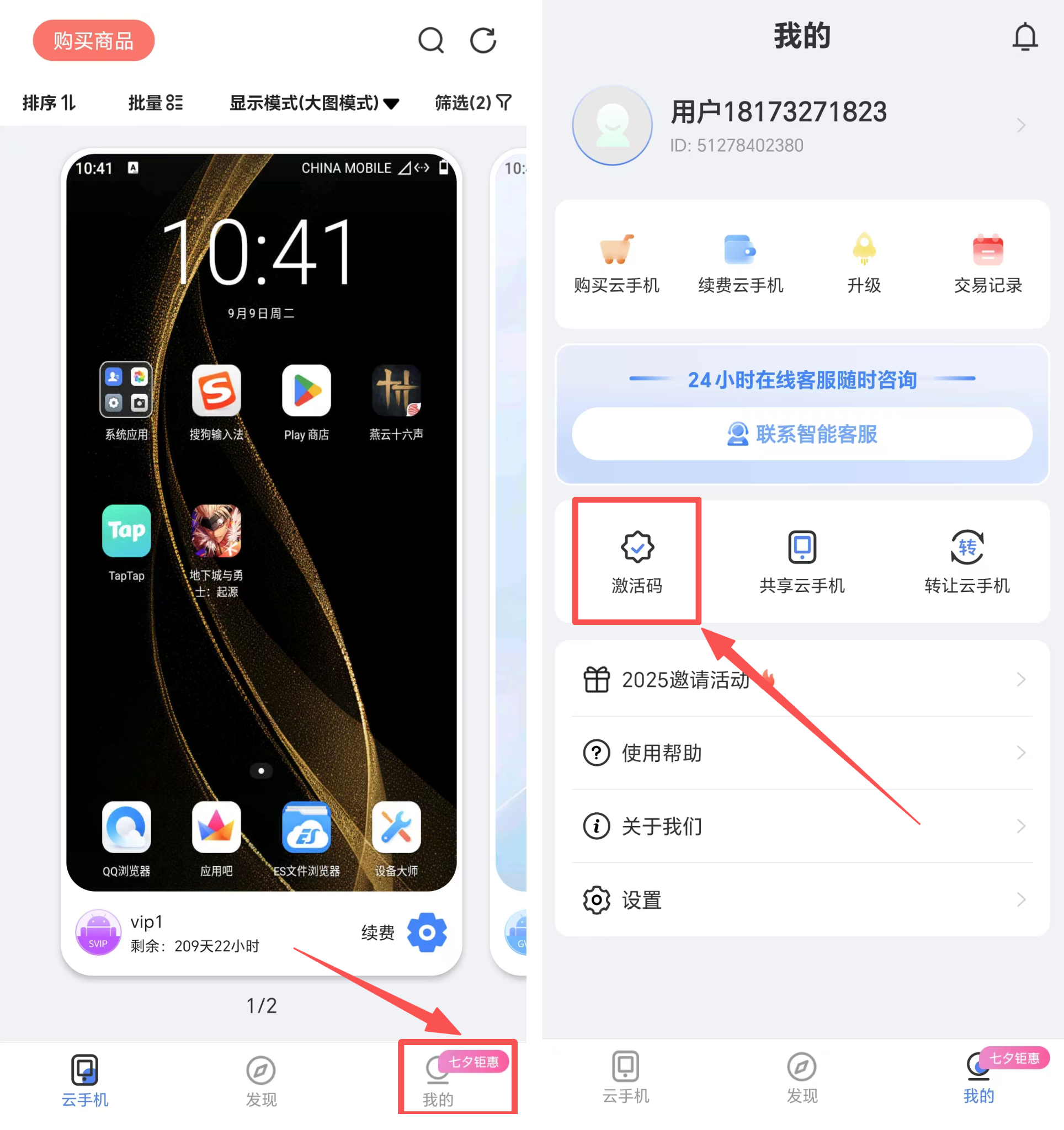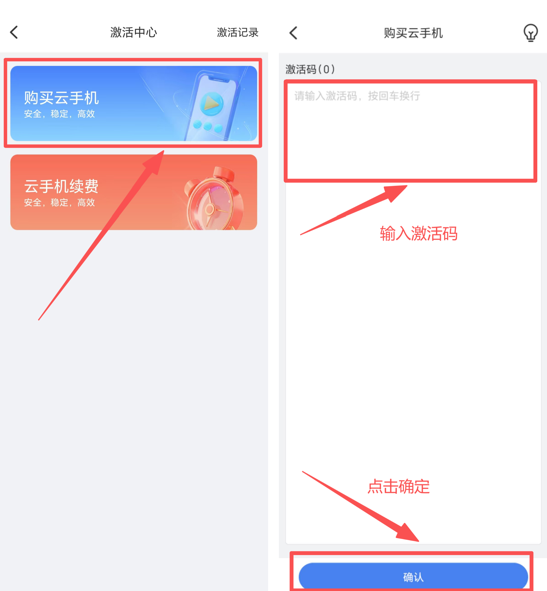 我的---激活码---购买云手机---输入激活码---点击“确认”按钮使用激活码;
