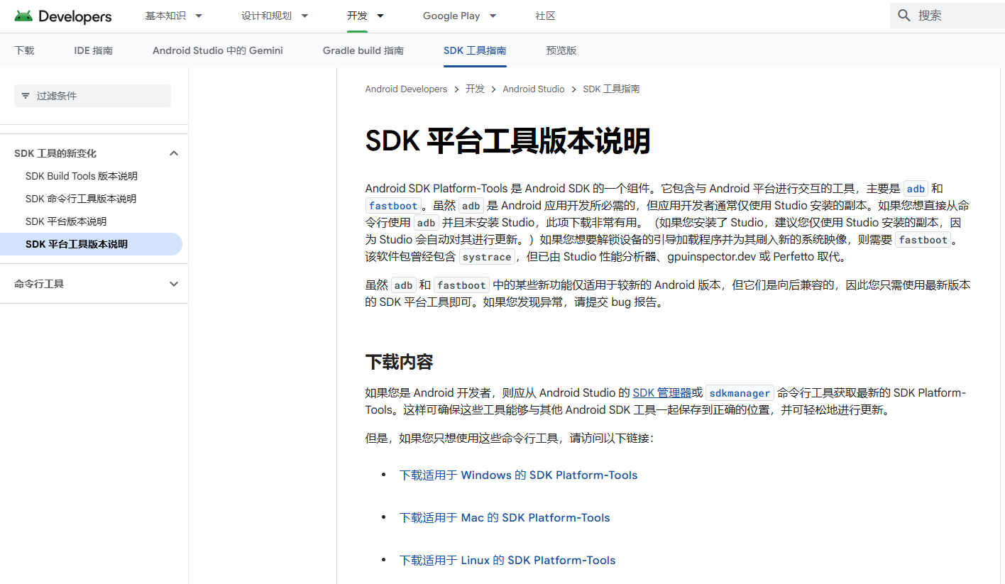 方法一(推荐非开发人员):前往官方网站下载ADB安装包:搜索“SDK平台工具版本说明官网”进入官方网页后选择电脑对应的平台进行下载。