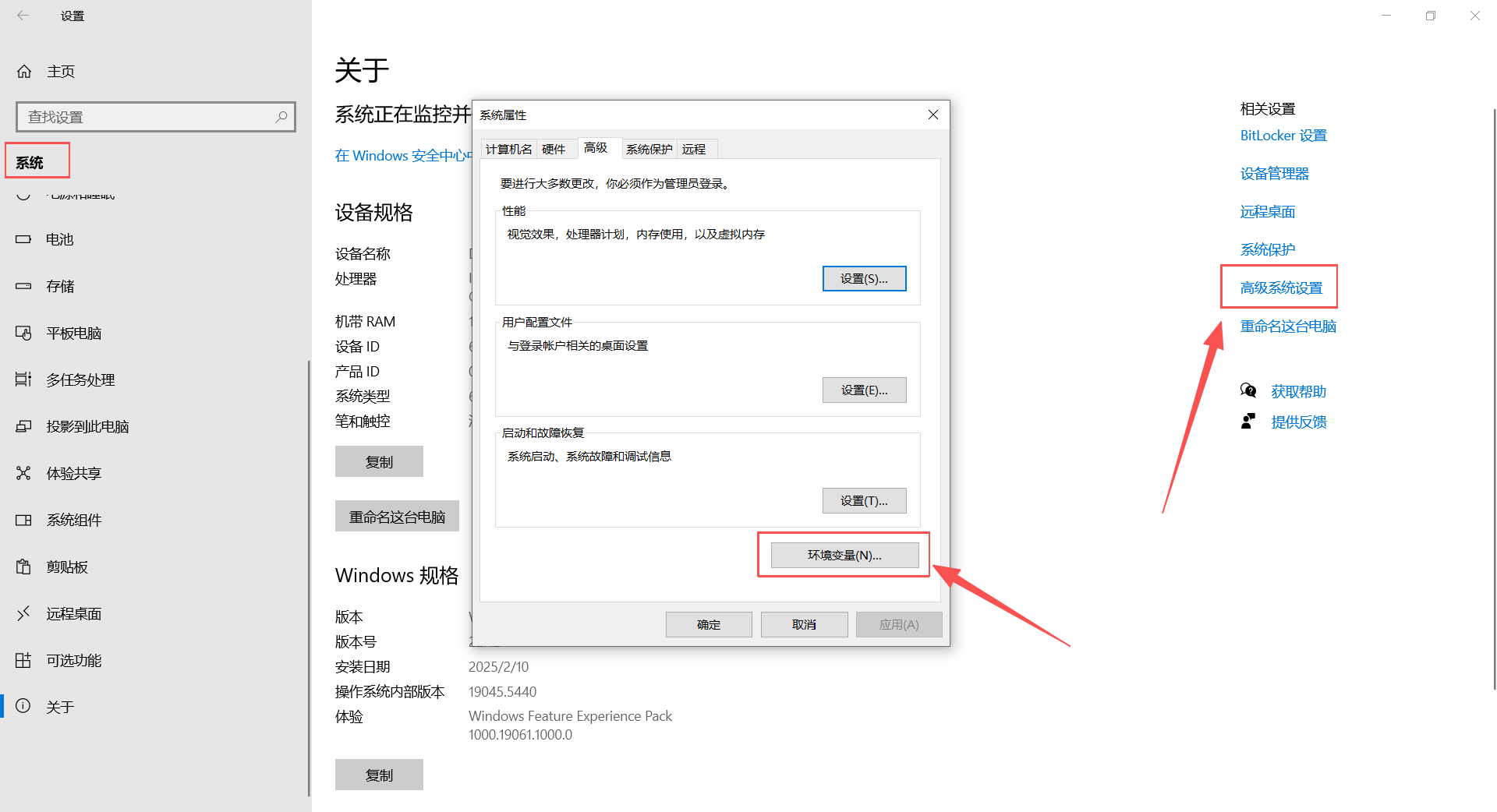 (1)打开电脑的设置,选择“高级系统设置”后再点击“环境变量设置”。