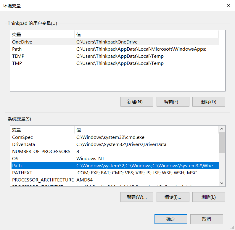 (2)选择“系统变量”中的“Path”并点击“编辑”进入“编辑环境变量”页面。