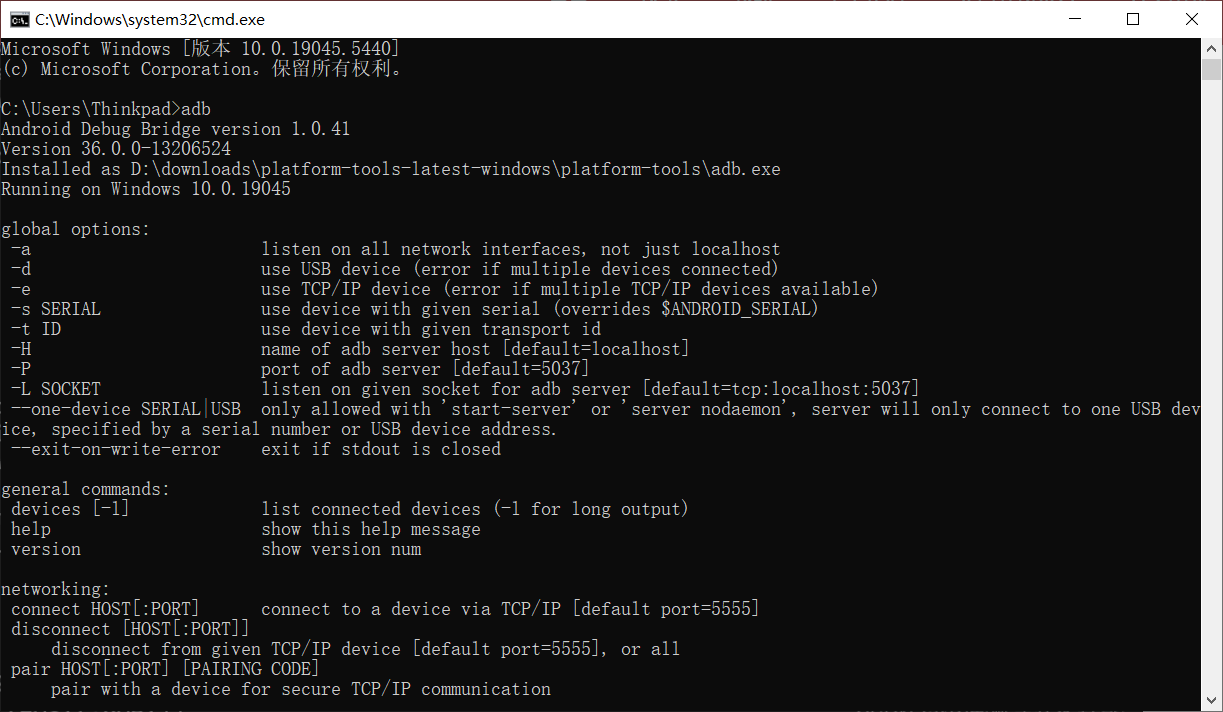 (4)点击“确定”保存,配置成功后在命令行输入“adb”,输出结果如下,则代表adb已安装成功。