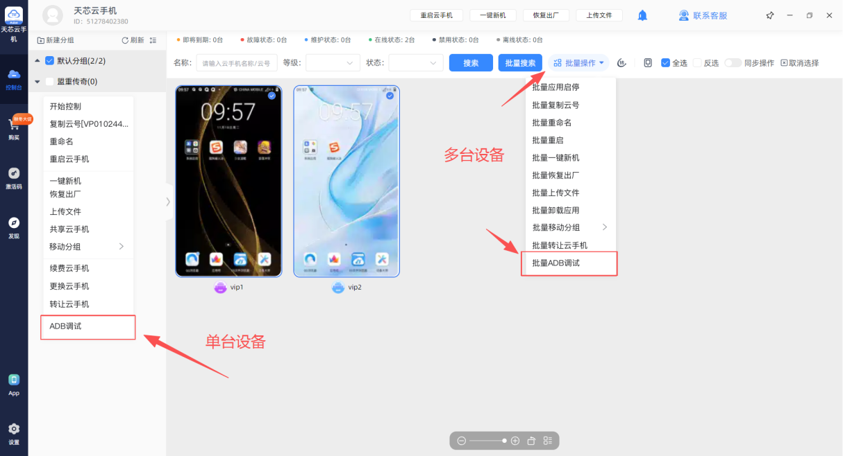 如果需要对多台云手机进行设置,批量勾选云手机后,点击“批量操作”,然后在批量操作菜单中选择“批量ADB调试”。