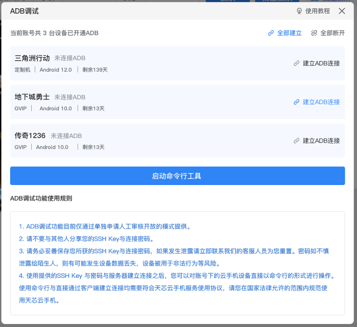 4.点击“建立ADB连接”或“全部建立”按钮以连接这些设备的ADB能力。