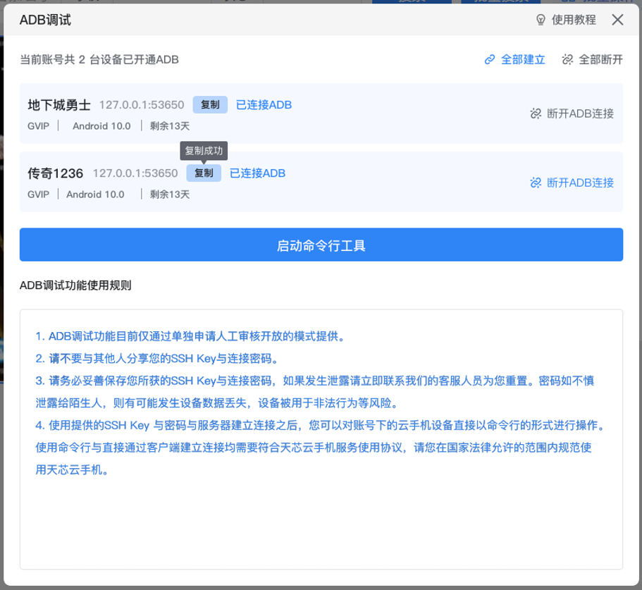 1.复制连接命令:在ADB调试对话框中,点击想要进行连接的设备名旁边的复制按钮将连接命令与端口号复制到剪贴板。