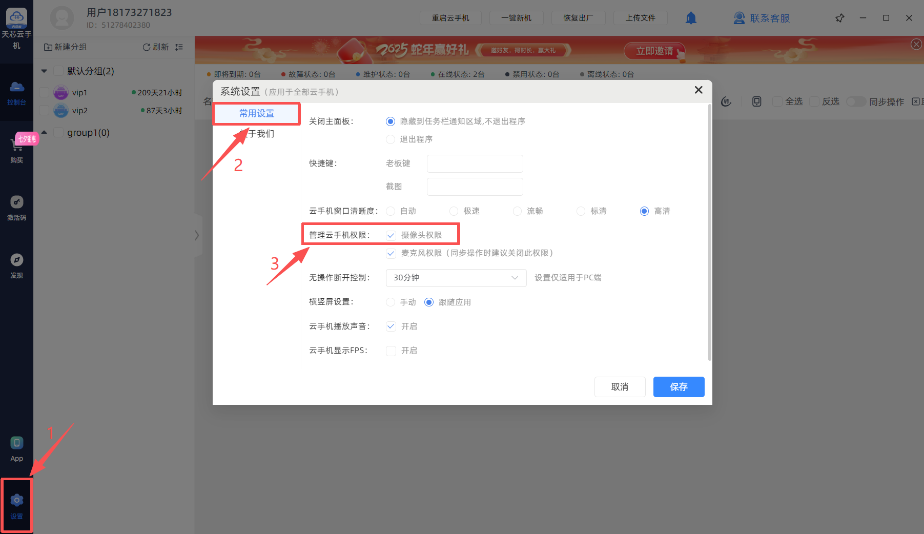 目前云手机支持调用本地手机摄像头,如要使用摄像头权限,需在APP内设置-管理云手机权限处设置,安卓端可针对单台或多台云手机进行开启/关闭摄像头权限。