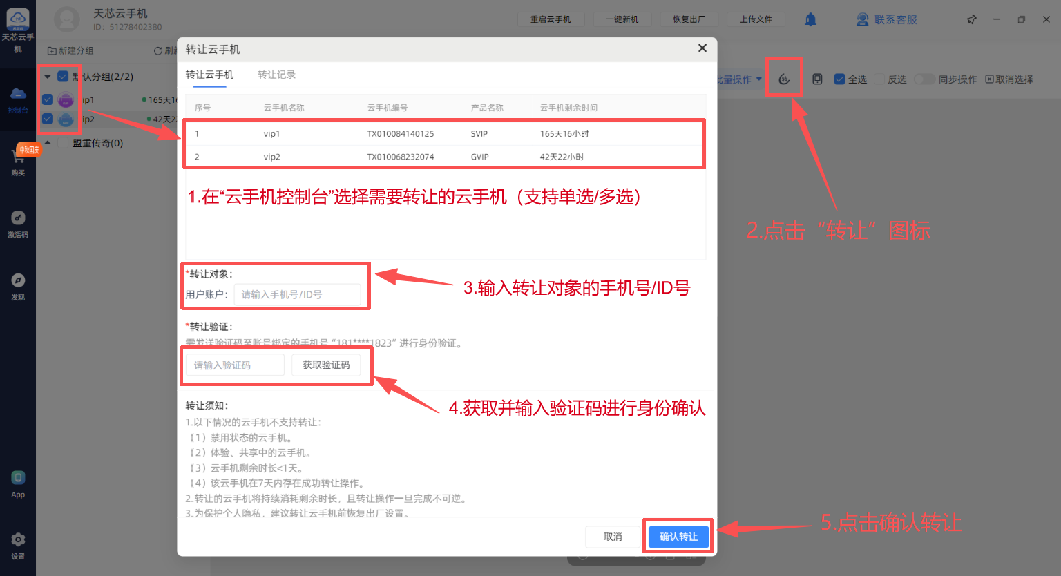 2.在客户端顶部操作栏点击“转让”图标弹出“转让云手机”操作框。