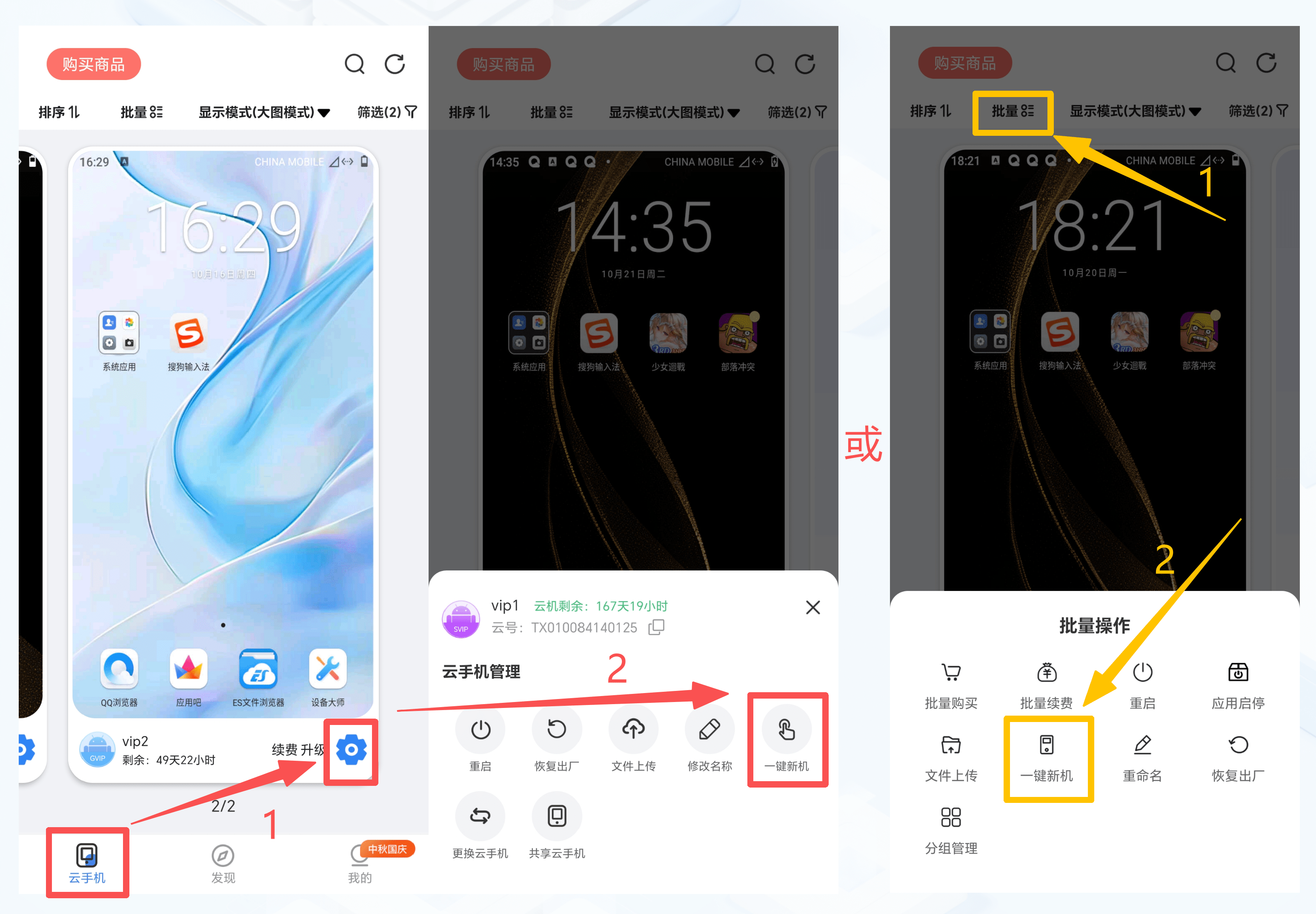 (2)对多台云手机操作:在云手机界面顶部栏点击“批量”—点击“一键新机”—选择云手机—点击确认,即可进入一键新机页面。