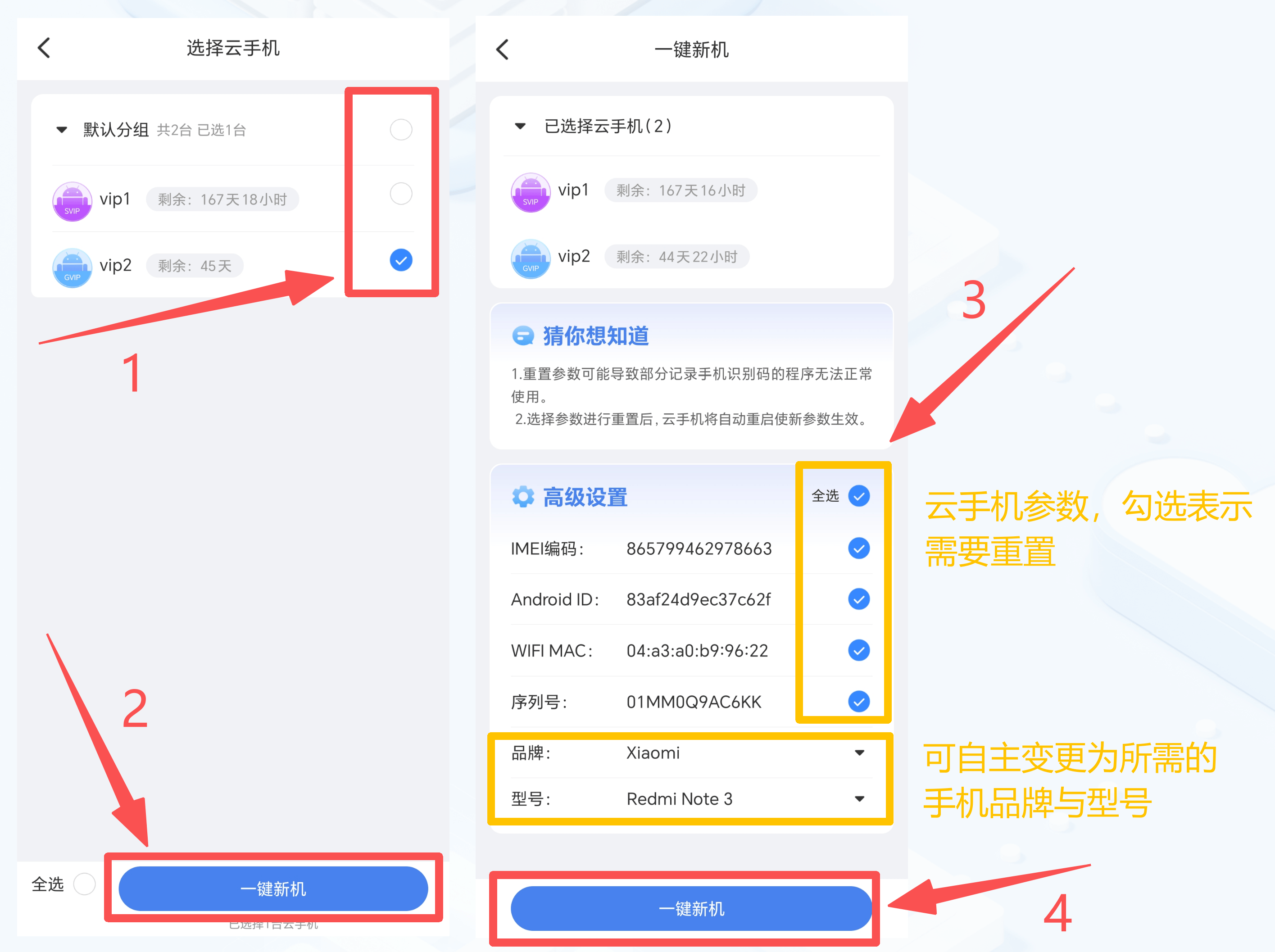 2.在一键新机页面选择需要重置的云手机参数和品牌型号,点击“一键新机”后即可对所选云机进行批量一键新机操作。