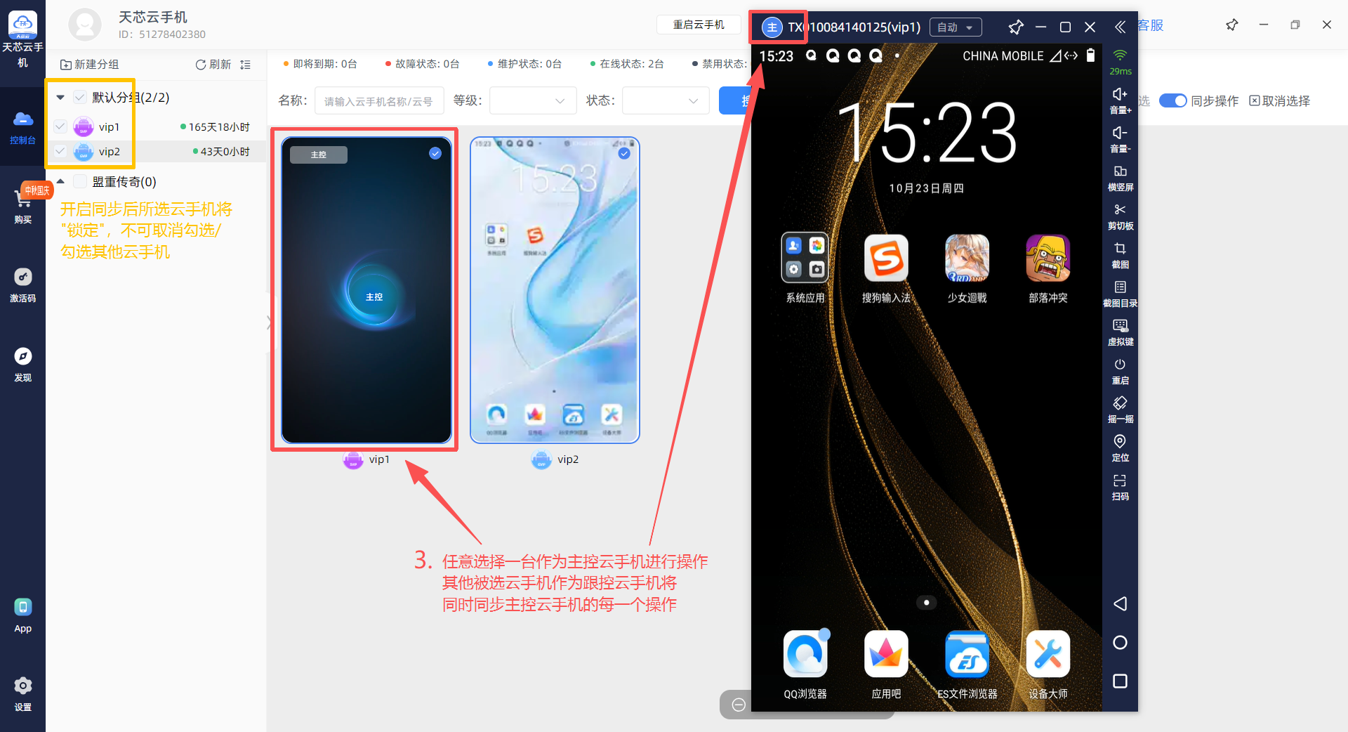 2.在已选择的云手机中任意选择一台作为主控云手机进行操作,其他被选云手机作为跟控云手机将同时同步主控云手机的每一个操作。