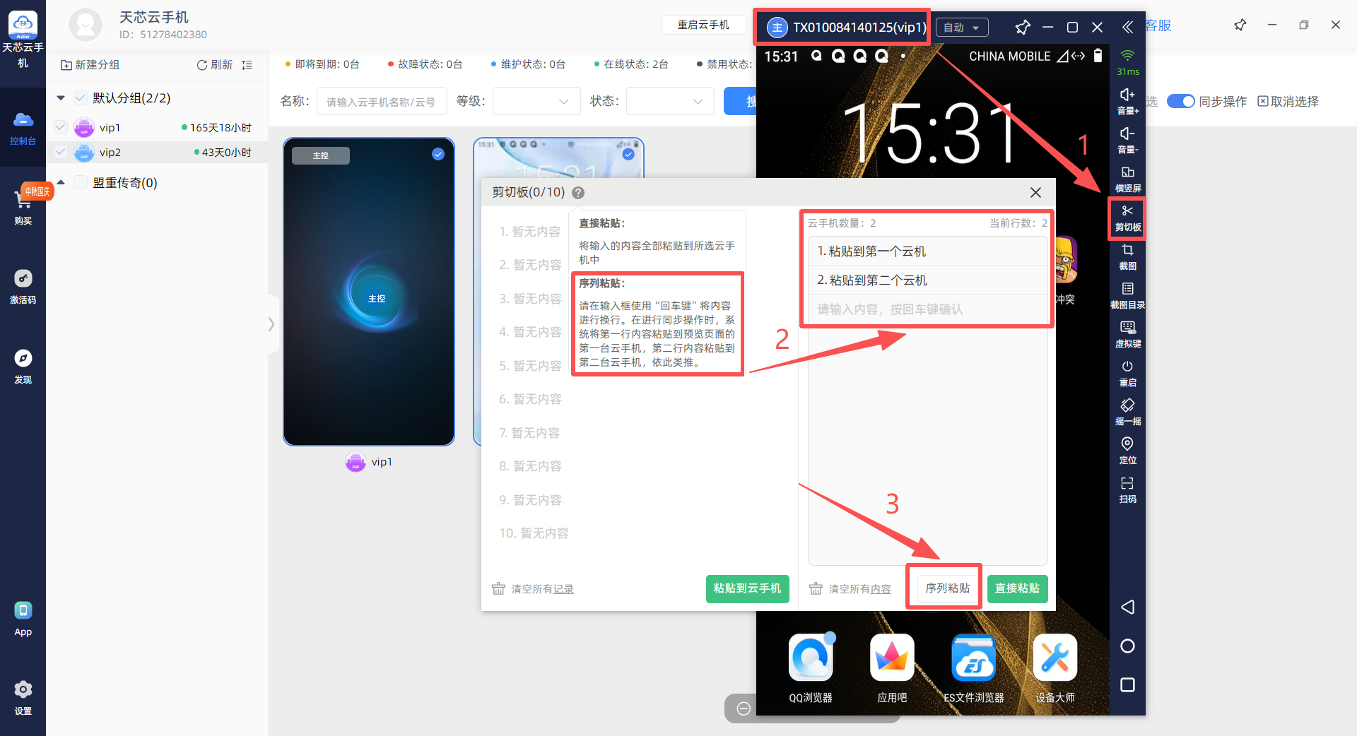 3.点击“序列粘贴”将内容分别粘贴到云手机内剪切板上。
