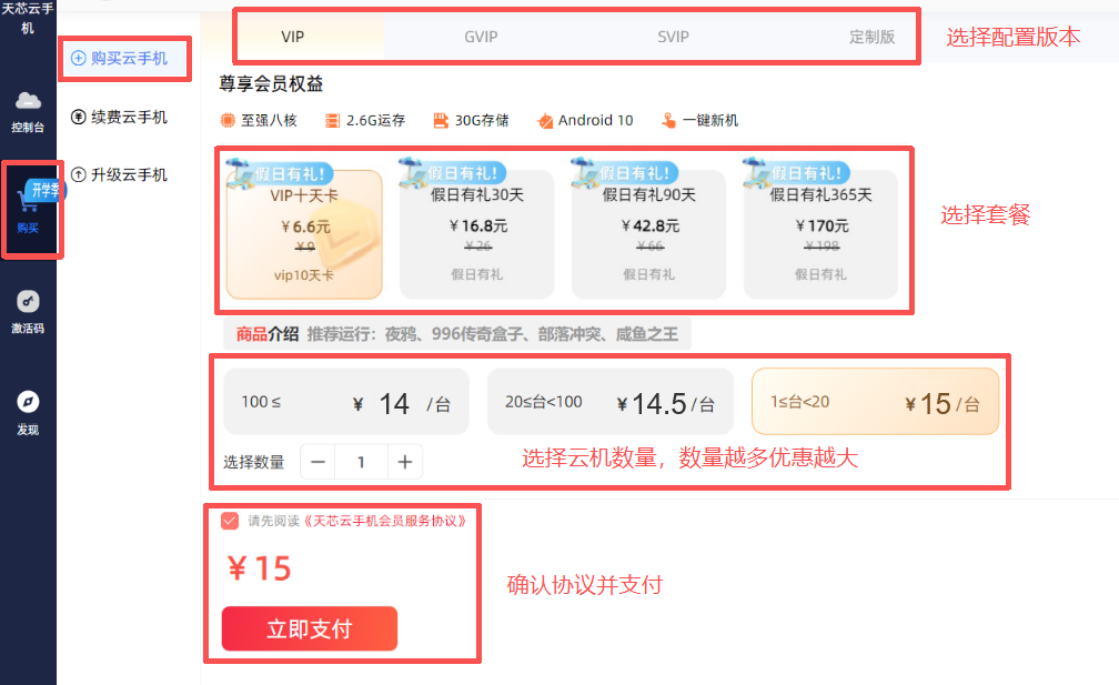2.在云手机购买页面选择您需要的配置版本、套餐、云机数量和支付方式,手动勾选《天芯云手机会员服务协议》并支付。