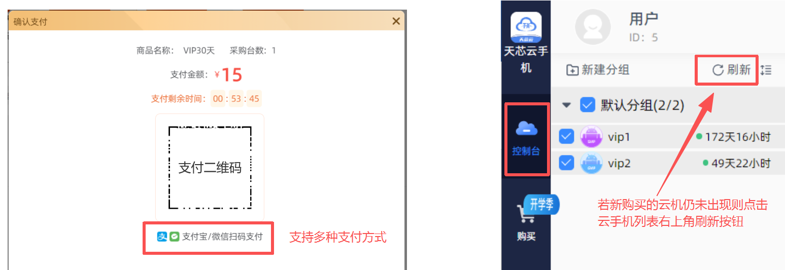 2.用户可选择微信扫码/支付宝扫码两种方式进行支付,支付完成后返回“控制台”页面,请耐心等待3-5s,若新购买的云机仍未出现则点击云手机列表右上角刷新按钮进行刷新。