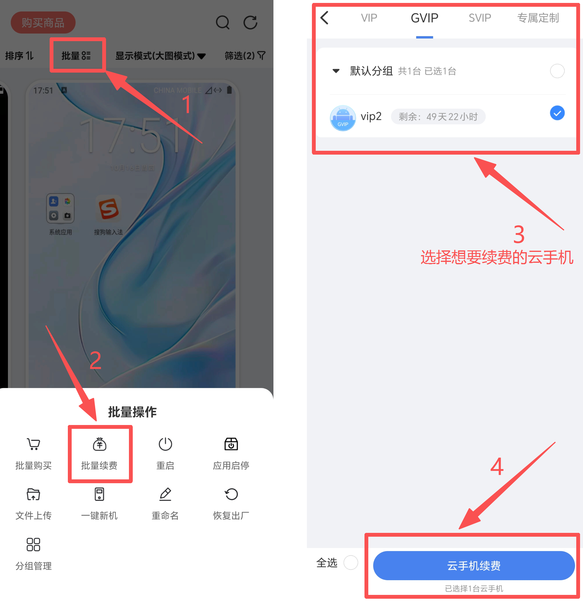 (2)多台云手机续费:点击顶部栏“批量”-“批量续费”进入云手机选择页面,选择需要续费的云手机(每次仅支持同时续费相同版本的多台云手机)并确认后进入云手机续费页面
