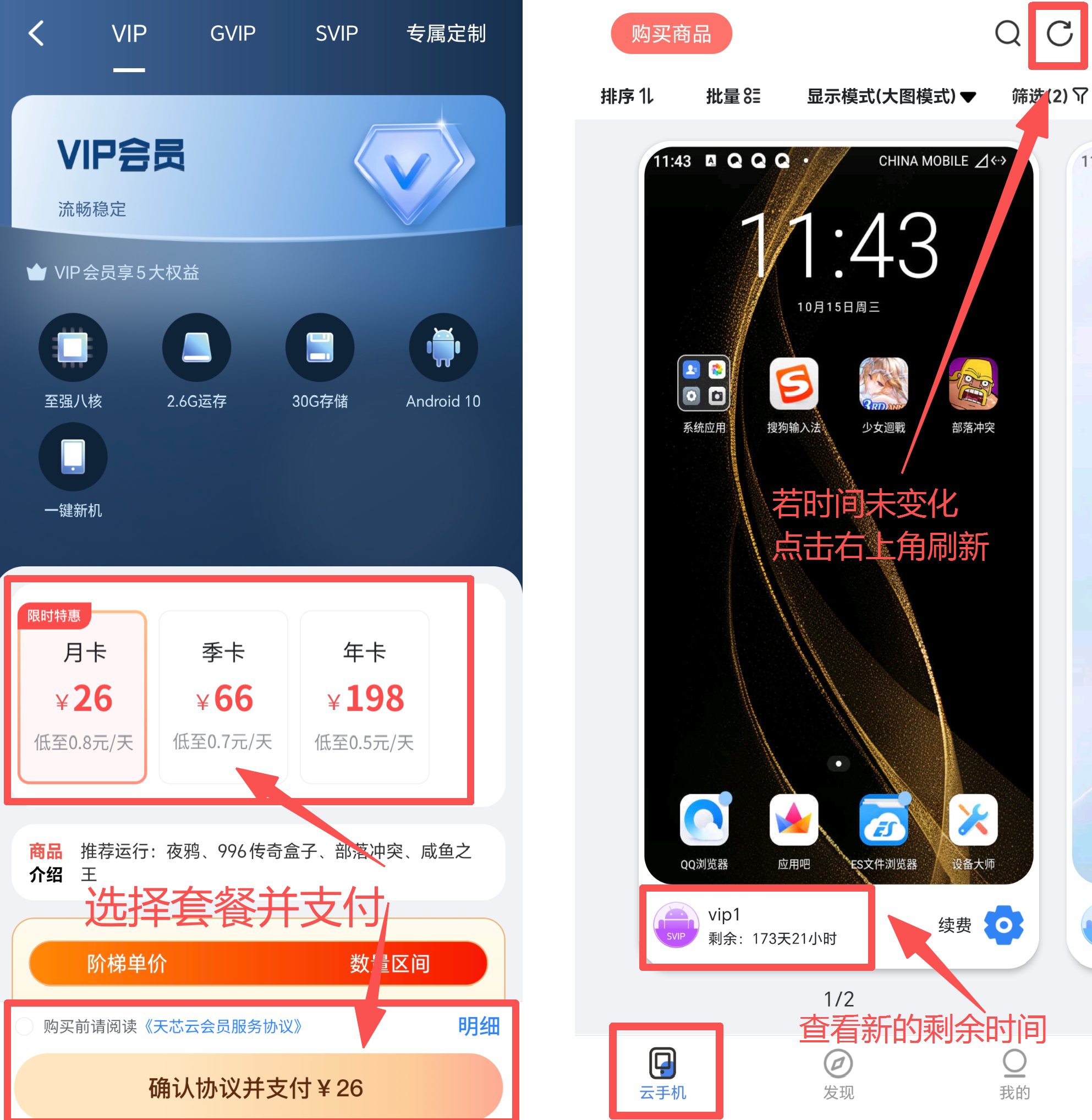 3.支付完成后回到客户端“云手机”页面,查看续费后云手机的新剩余时长。