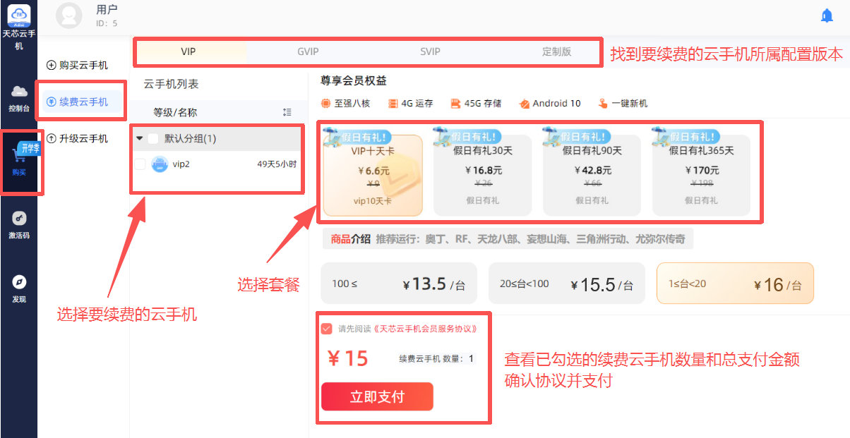 1.在客户端“购买”页面-续费云手机页面,找到需要续费的云手机所属配置版本,选择要续费的云手机和续费套餐,确认无误后手动勾选《天芯云手机会员服务协议》并点击“立即支付”。(支持单台或多台同时续费,但每次仅支持同时续费相同版本的多台云手机)