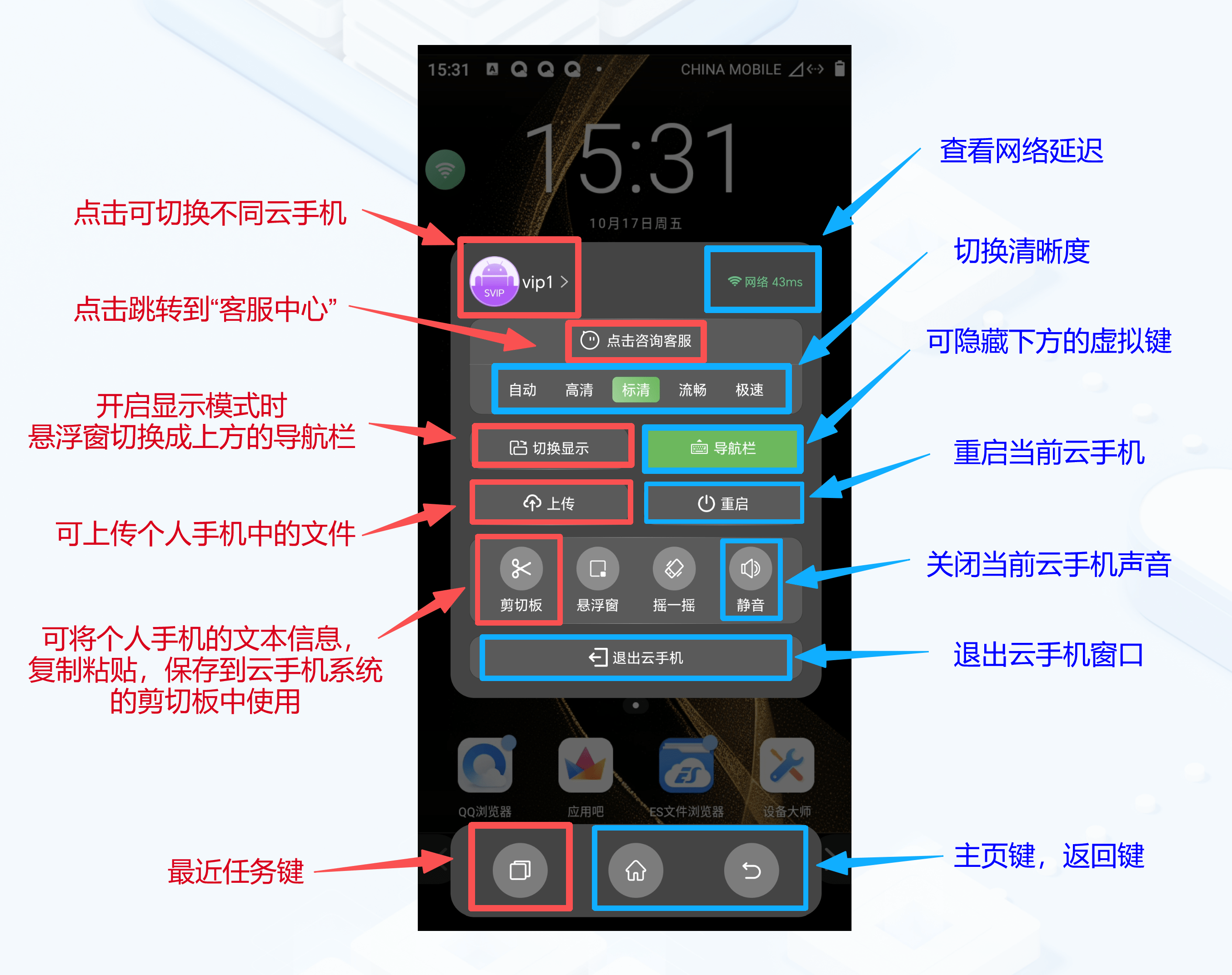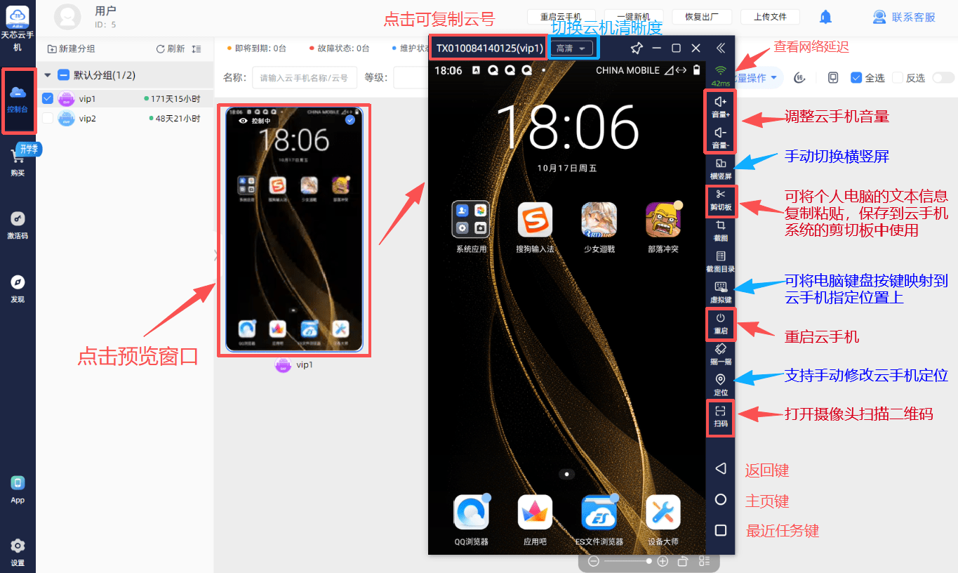 以下是在安卓客户端内云手机窗口功能的介绍: