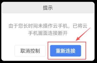 出现这种情况是因为用户在云手机上长时间没有操作,出于节省服务器资源的目的将云手机画面连接自动断开,断开连接不会影响云手机的运行,点击“重新连接”即可继续使用。