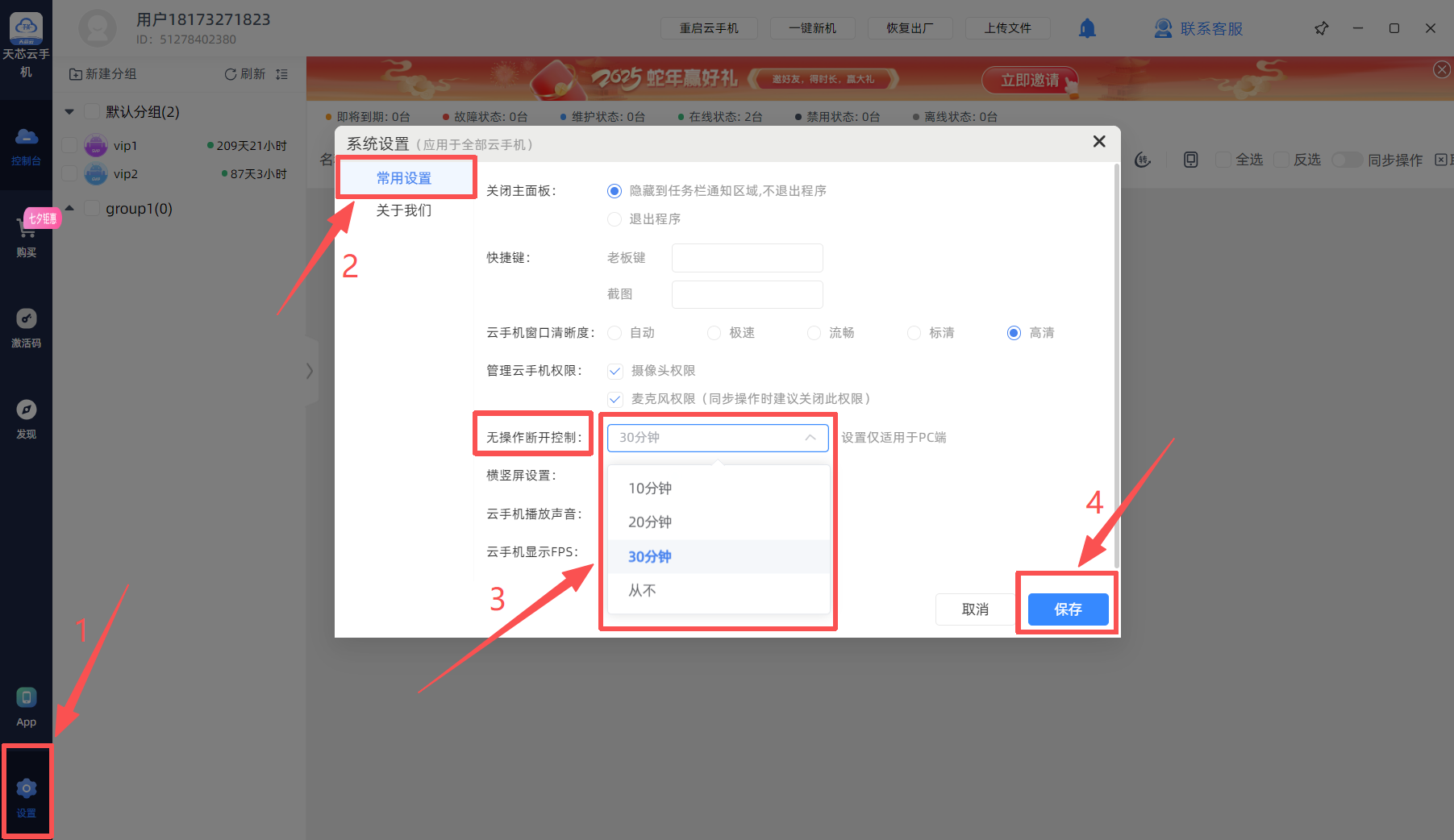 若您想要修改“无操作断开控制”的时间间隔,可进入设置-操作设置-无操作断开控制进行设置,点击“保存”完成修改。